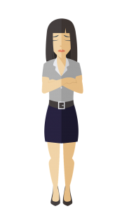 Zeichnung / Grafik: Jüngere Frau in kurzem Rock, Pumps und Bluse steht da mit verschränkten Armen und geschlossenen Augen, Gesicht sieht unzufrieden und kritisch aus